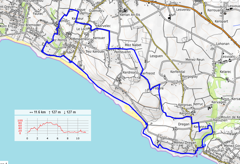Distance 11,5 Km ; dénivellé : 100 m. Départ : parking Pors-Poulhan ref : MN du 2021-12-12