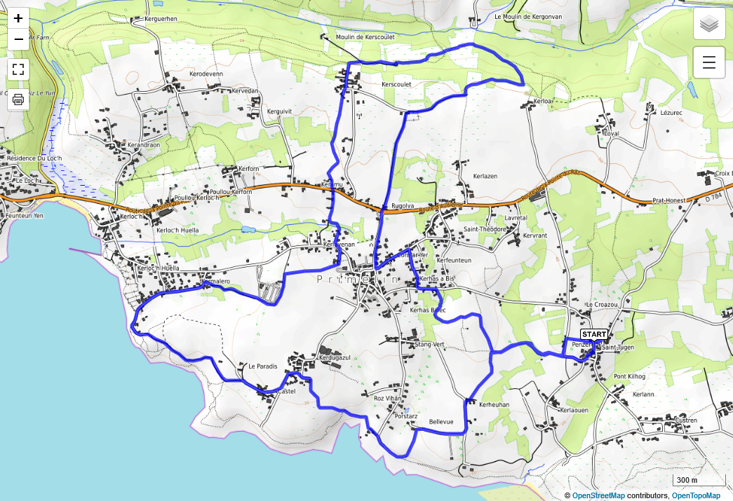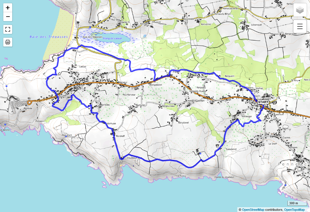 Distance 11 Km ; dénivellé : 100 m. Départ : Chapelle St Tugen ref : CA70 du 2021-10-12